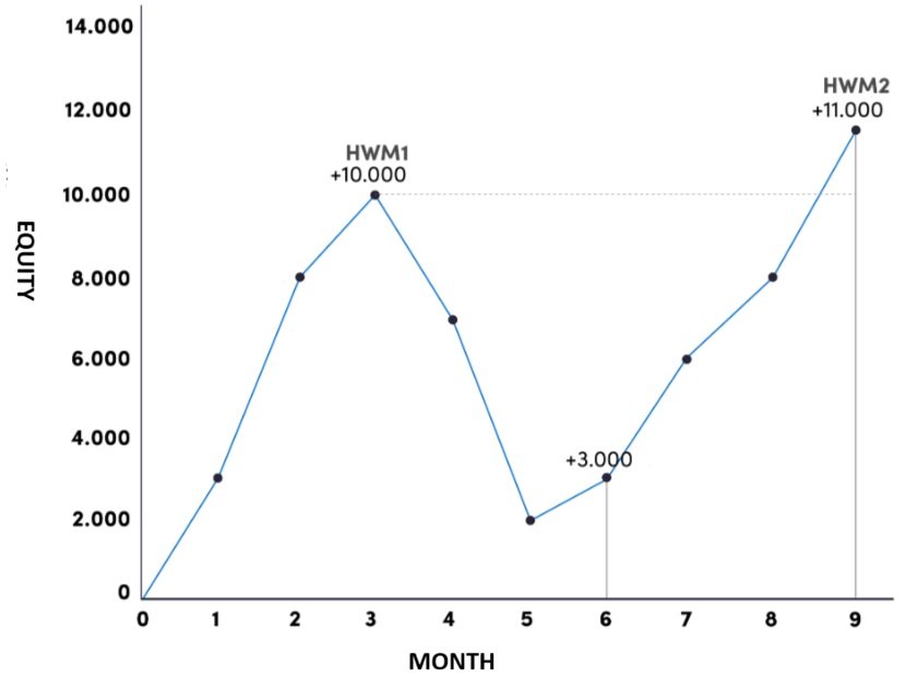 The graph illustrates the calculation of the high-water mark (HWM) over successive months.
